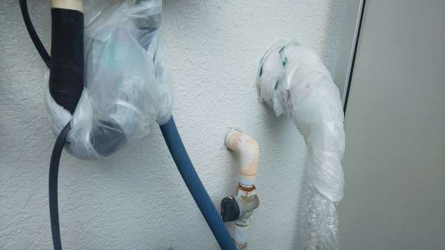 もし保温材が手に入らない緊急の場合は、古い毛布や厚手のタオルを配管に巻き付け、上からビニール袋をかぶせて雨水で濡れないように固定するだけでも立派な対策になります。